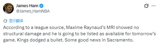 北京时间1月4日,据国王队记James Ham报道,联盟消息人士透露,新秀雷诺的核磁共振检查结果显示,其伤病未造成结构性损伤,他将被列入明日对阵雄鹿的出战名单。国王队可谓是逃过一劫,这对他们而言无疑是一则好消息。