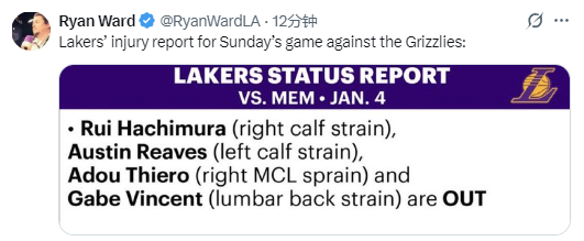北京时间1月4日,湖人队发布了明日对阵灰熊队比赛的伤病报告,里夫斯等4名球员缺阵,具体情况如下: