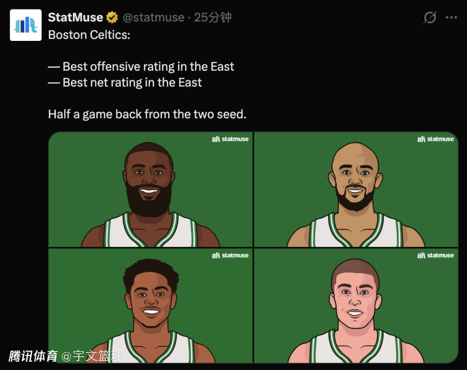 即便球队没有塔图姆,他们依旧有两项数据领跑东部。凯尔特人打出东部最佳的进攻效率值,全联盟也仅次于掘金。同时他们的净胜分是东部榜首,仅次于西部三大劲旅雷霆、掘金和火箭。