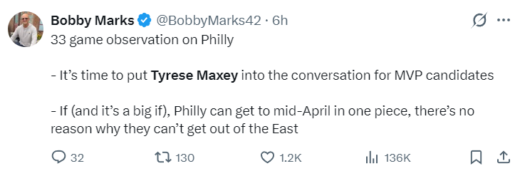 ESPN薪资结构专家鲍比-马克斯:是时候将马克西纳入MVP候选人行列了,假设费城进入4月中旬全队都保持健康,那么他们没有理由不冲出东部。