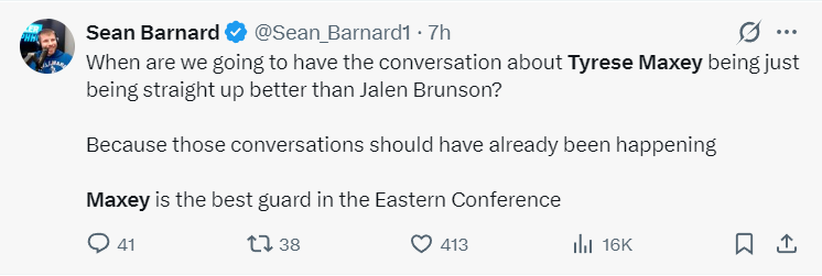 NBA记者Sean Branard写道:我们应该好好聊聊一个问题,那就是马克西与布伦森两人谁更出色,我认为马克西已经是东部最出色的后卫。
