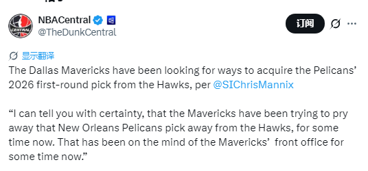 北京时间1月5日,据记者Chris Mannix报道,独行侠队一直在寻求途径,试图从老鹰队手中得到鹈鹕队的2026年首轮选秀权。