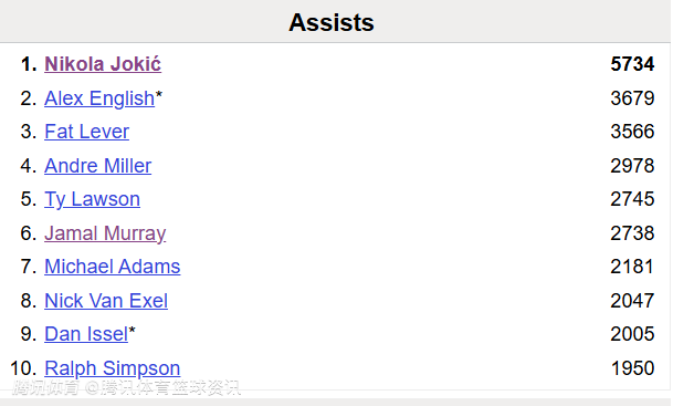 目前,排在穆雷之前的还有约基奇(5734次)、英格利什(3679次)、莱沃(3566次)、安德烈-米勒(2978次)。