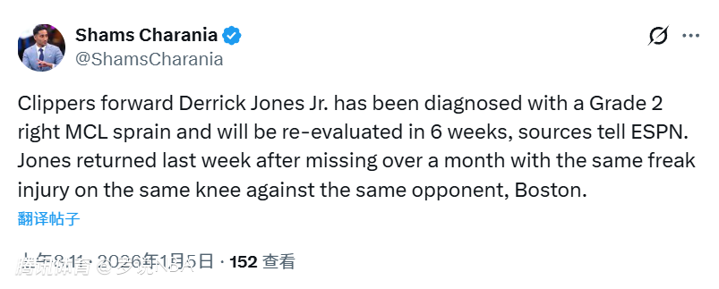 北京时间1月5日,据名记Shams报道,消息源透露,快船队前锋小德里克-琼斯被诊断为右膝内侧副韧带二级扭伤,六周后将重新评估伤情。上周他才刚刚伤愈归队,此前他曾因同一膝盖、在对阵同一对手凯尔特人时遭遇的同一意外伤病,缺席了一个多月的比赛。