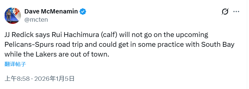 此外,雷迪克透露,里夫斯和八村垒将缺席球队即将开启的客场之旅(包括周三对阵鹈鹕以及周四对阵马刺的比赛)。两人将留守洛杉矶,继续进行康复治疗。
