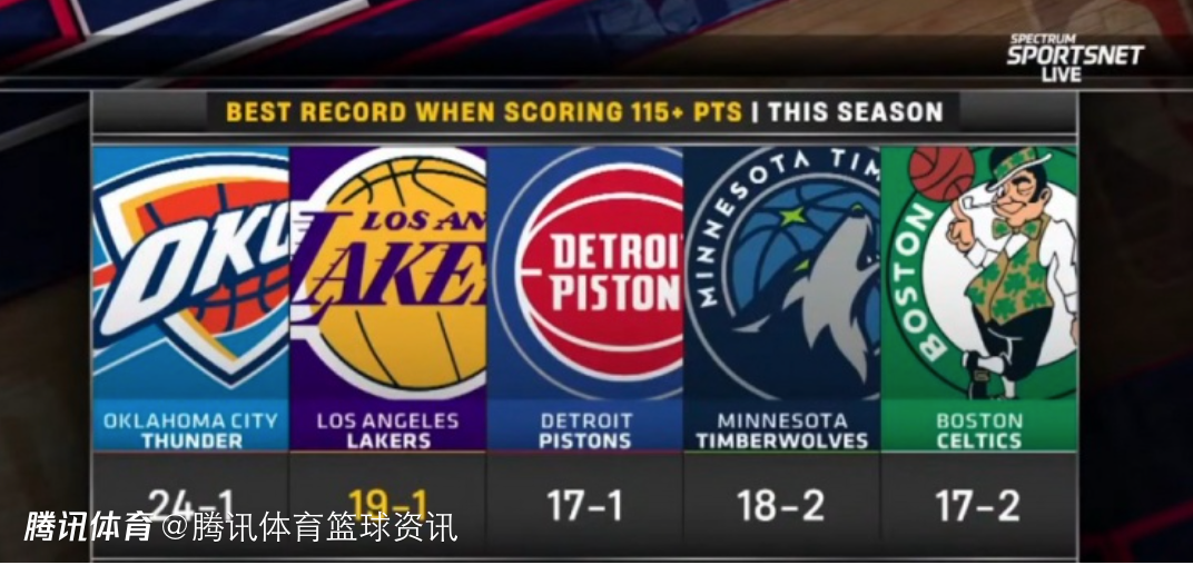 北京时间1月5日,据统计,本赛季湖人得分115+时,球队的战绩为19胜1负,全联盟仅次于雷霆的24胜1负。