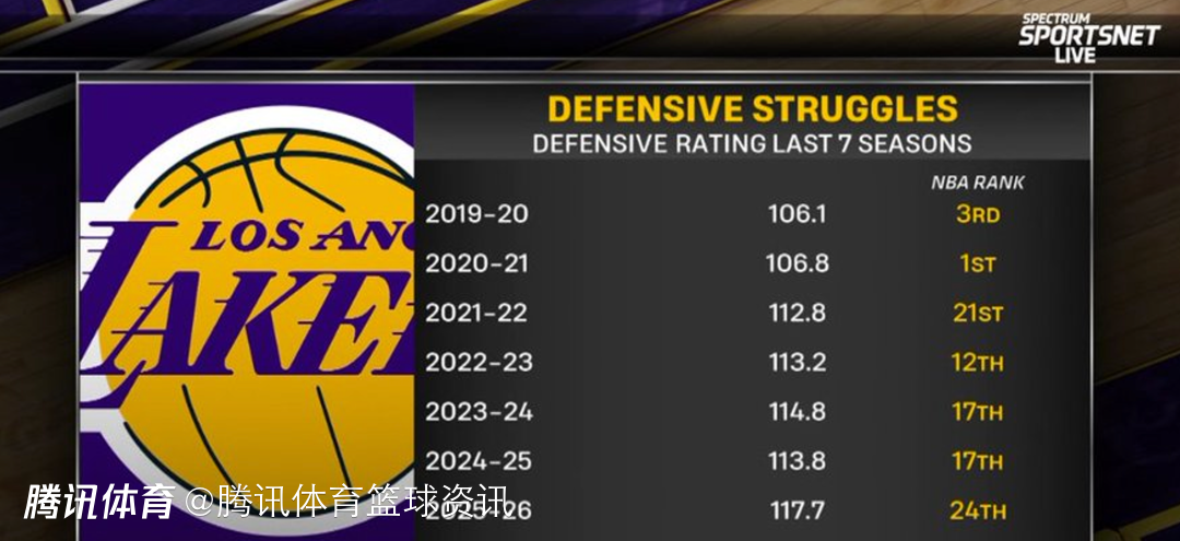 北京时间1月5日,据统计,湖人本赛季防守效率仅有117.7,为近7个赛季最差。