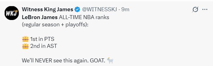 湖媒WKJ:詹姆斯在NBA历史,总得分历史第一,总助攻历史第二,我们以后再也看不到这样的球员了,GOAT。