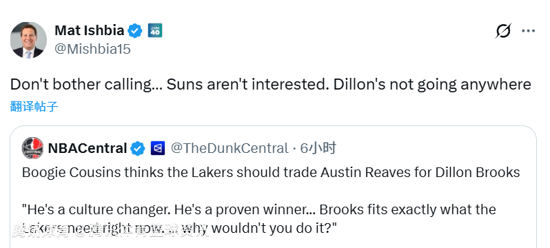 伊什比亚在社媒上回应道:“不必再向太阳队询价了,我们对此毫无兴趣,狄龙哪儿也不会去。”