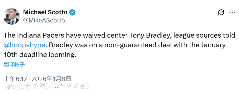 北京时间1月6日,据记者Michael Scotto报道,联盟消息人士向其透露,步行者队已裁掉中锋托尼-布拉德利。布拉德利此前与球队签下的是一份无保障合同,而合同保障期限的截止日1月10日已近在眼前。
