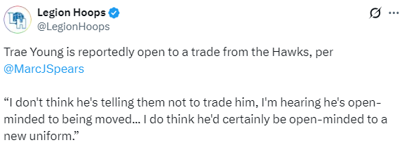 谈到特雷-杨对离开亚特兰大的态度,名记Marc J. Spears在节目中透露,他表示:我听说他对这件事非常谨慎,毕竟他从小目睹了杜兰特离开俄克拉荷马的情景,也清楚其中的种种影响,所以无论未来是否留在亚特兰大,他都希望能保持与这座城市的联结;他不会主动要求交易,但也没明确拒绝被交易的可能,他对转会持开放态度,愿意接受新的队服。