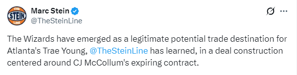 名记Marc Stein则报道,消息人士透露,奇才已成为老鹰球星特雷·杨一个潜在的交易目的地,该交易框架的核心是围绕CJ-麦科勒姆即将到期的合同展开。