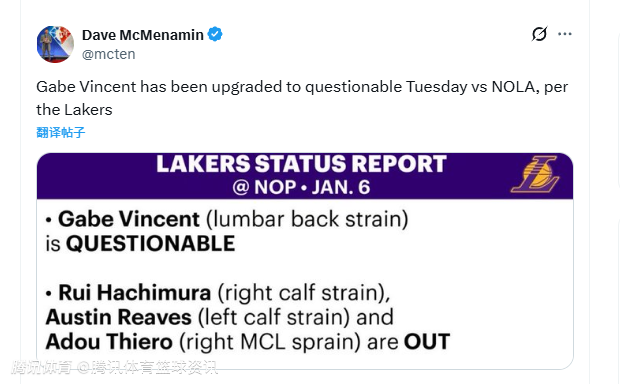 北京时间1月6日,NBA常规赛继续进行,湖人明日对阵鹈鹕。赛前,湖人方面公布球队本场比赛伤病报告。文森特伤病状态已更新为出战成疑。