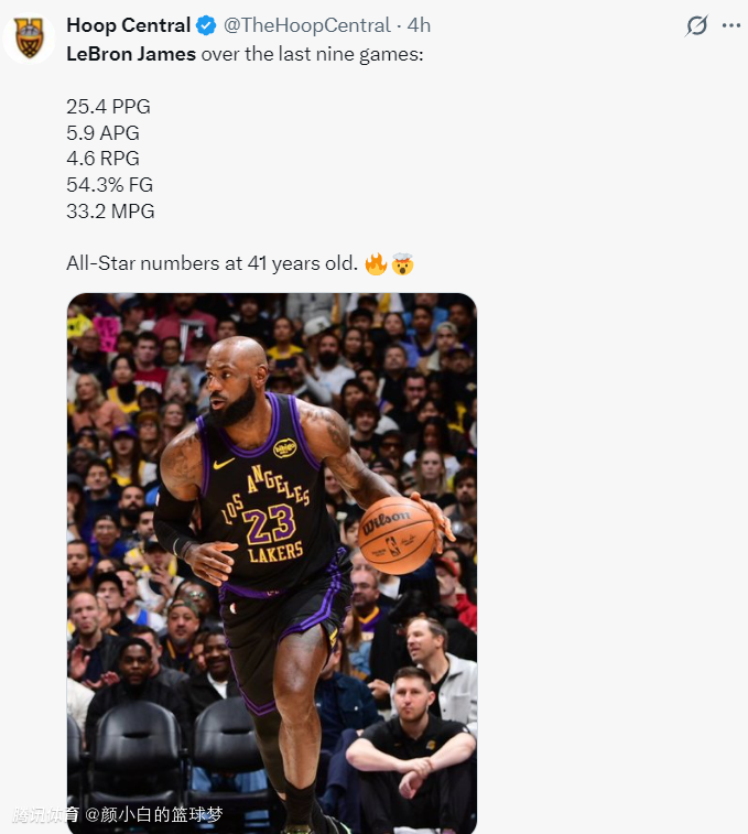 过去詹姆斯9场比赛,场均33.2分钟,拿到25.4分5.9助攻4.6篮板,命中率54.3%,美媒认为41岁的他还是有全明星水准。