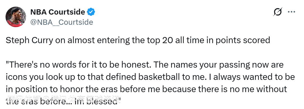 库里说道:“说实话,这一切难以言表。我现在超越的这些名字,都是我曾经仰望的偶像,是他们定义了我所认知的篮球。我一直希望能处于这样一个位置,去致敬在我之前的那些时代,因为没有那些时代,就没有今天的我,对此我心怀感恩。”