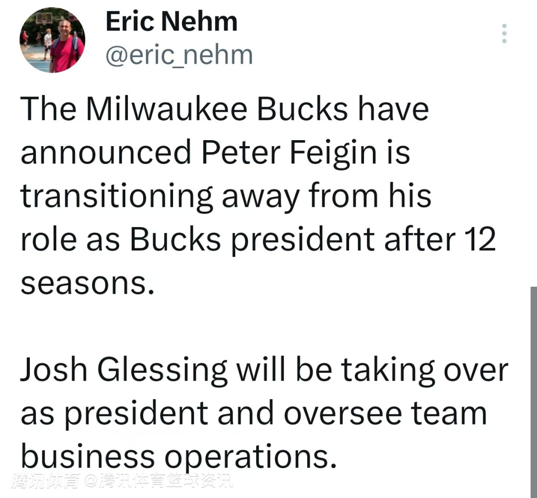 北京时间1月6日,雄鹿队官方宣布,现任球队总裁费金将在本赛季结束后正式卸任,结束其长达12年的任期。球队同时宣布,格莱辛将接任并负责球队的商业运营事务。
