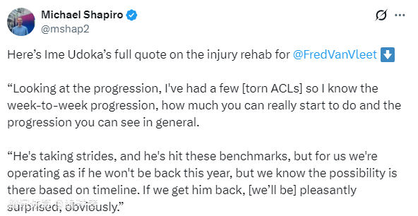 继续说道:他正在取得进步,也达到了预定的康复目标,但我们目前还是按照他本赛季不会复出的计划来安排,不过我们也知道根据时间表,他复出的可能性是存在的。如果他能复出,我们当然会感到惊喜。