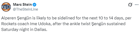 北京时间1月6日,火箭内线申京的伤情更新,今日火箭主教练乌度卡表示,由于右脚踝扭伤,申京的回归时间大概在10-14天内,预计他将休战6-8场比赛;亚当斯复出并且首发大战太阳,乌度卡证实范弗利特本赛季有望回归。