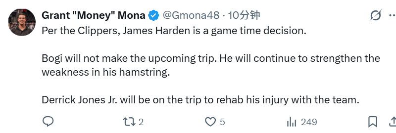 北京时间1月6日,NBA常规赛继续进行,快船对阵勇士。赛前,快船方面更新本场比赛伤情报告,哈登因右肩僵硬,出战状态为赛前决定。上一场打替补的祖巴茨,本场将首发出战。