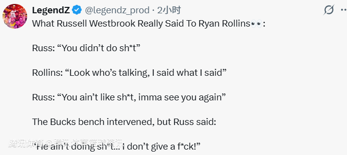 北京时间1月6日,唇语专家LegendZ发文,透露了昨日威斯布鲁克与罗林斯在比赛中互喷垃圾话的内容。