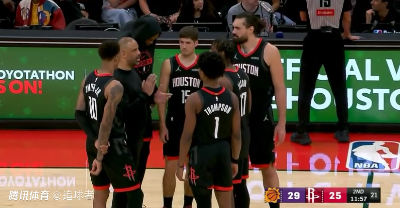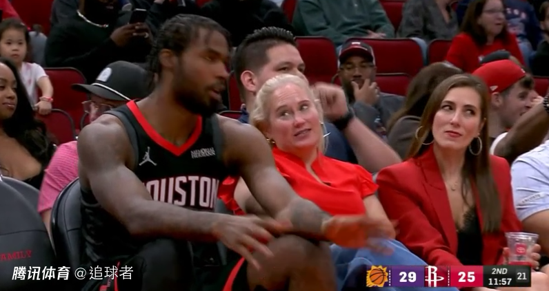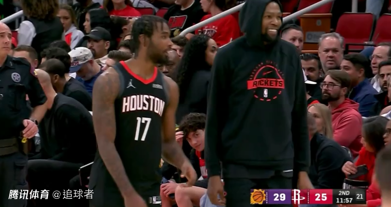 现场计时器故障期间,火箭和太阳两队球员只能被迫等待,杜兰特忍不住找裁判沟通,可裁判也没有办法;伊森坐在场边与女球迷闲聊,乌度卡把球员聚在一起开会,杜兰特也走过来,然后捂着嘴与伊森热聊,杜兰特咧嘴大笑十分开心。
