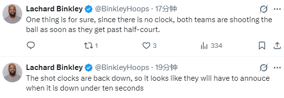 据火箭随队记者Lachard Binkley报道,现场改为人工提醒时间,他们每隔十秒钟就报一次时间和比分,我以前好像从来没见过这种情况。