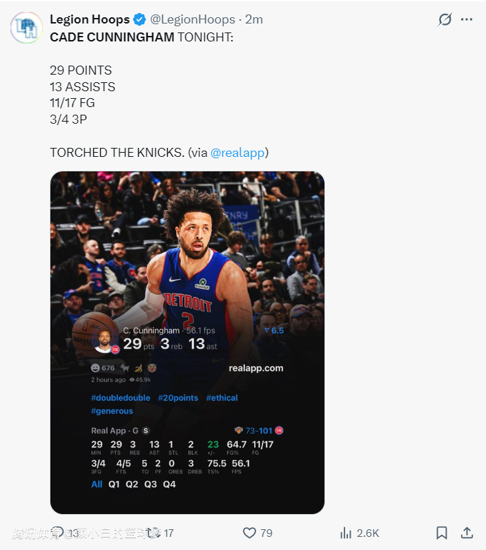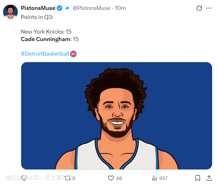 第二节坎宁安的轮换阶段他的发挥不多,但全队的士气已经起来了,这一节活塞单节净胜9分,第三节才是CC发挥的节次,他10分钟里8中5+三分2中2拿到15分2助攻1篮板1盖帽,尼克斯全队第三节才15分。