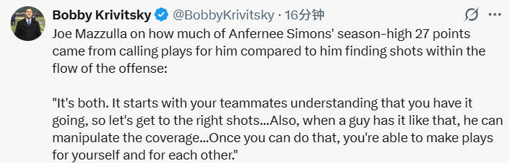 安芬尼-西蒙斯此役砍下赛季新高的27分,在谈到其得分源于战术专门设计还是进攻体系自然运转的问题,马祖拉表示:“两者皆有。首先需要队友们达成共识,当这名球员手感火热时,就要为他创造出优质的出手机会。此外,当球员打出这样的状态时,他本身就具备了牵制防守的能力。一旦能做到这一点,他既能为自己创造得分机会,也能带动队友参与进攻。”