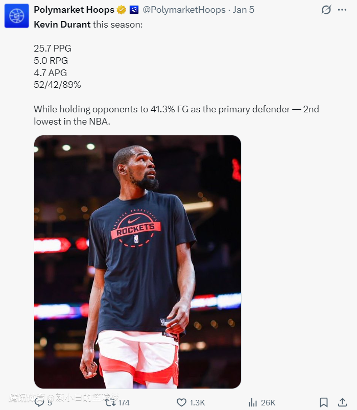 一天之前,美媒晒出杜兰特本赛季场均25.7分5篮板4.7助攻,命中率52%,三分命中率42%,罚球命中率89%,而且杜兰特限制对手命中率41.3%联盟第二低,37岁的老KD攻防一体。