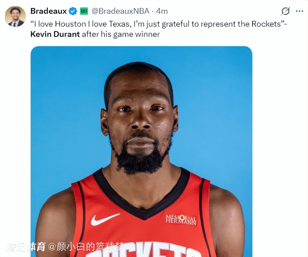 赛后杜兰特接受采访:我爱休斯顿,我爱德克萨斯州,我很庆幸能代表火箭队出战。
