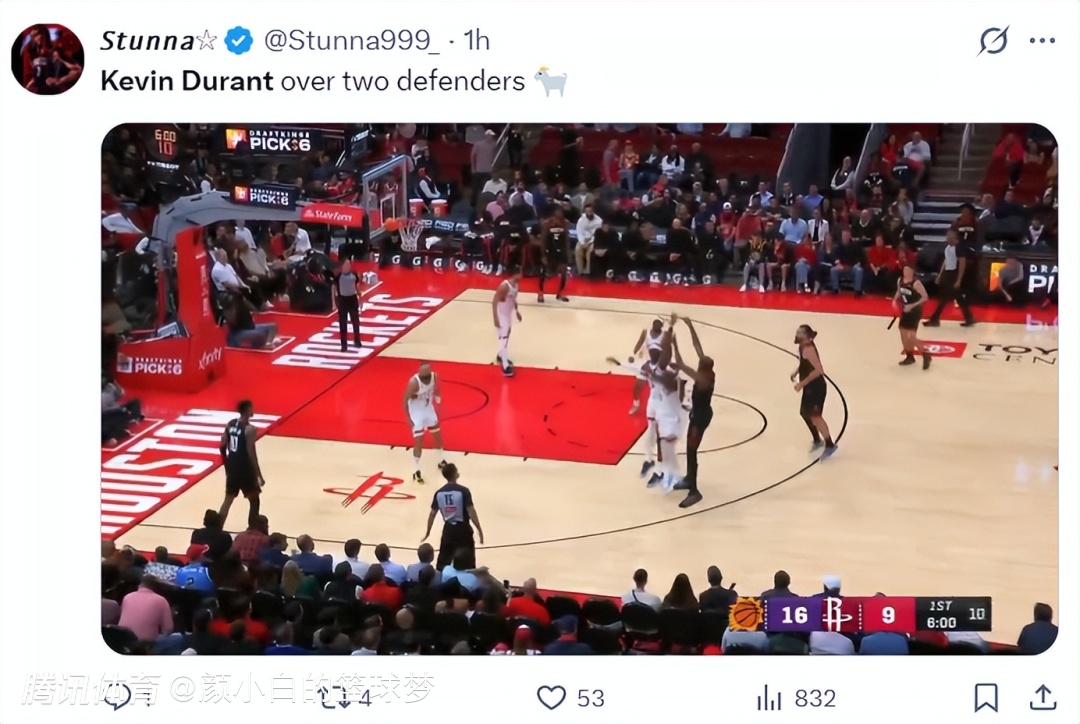 杜兰特首节面对两人的防守命中一个三分球,只可惜他上半场7次三分出手只命中一个,半场11中4拿到13分6篮板4助攻1盖帽,防守端大帽阿伦非常精彩,但此役杜兰特被太阳的双人夹击限制的很难受。