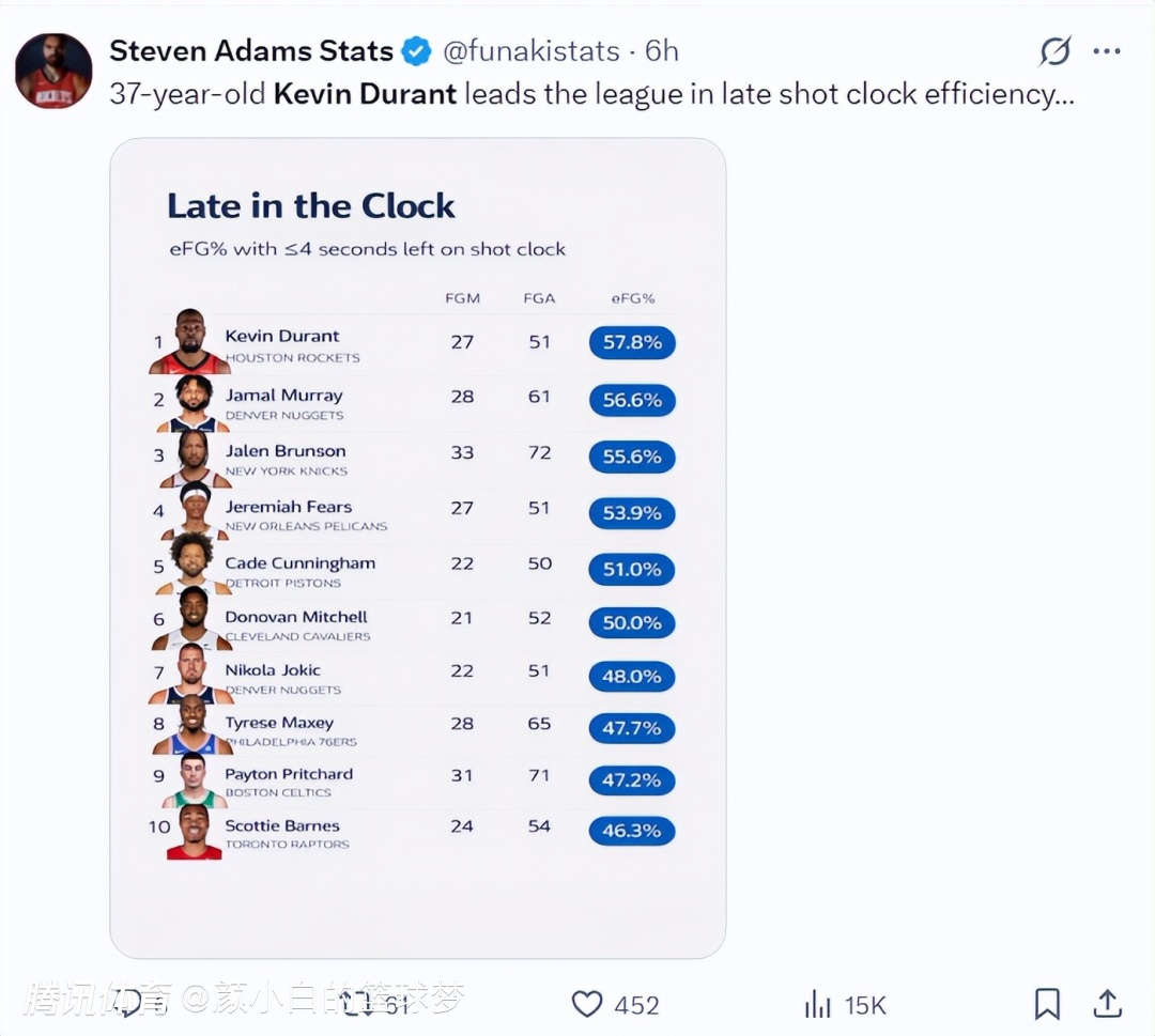除此之外37岁的老杜皇末节命中率57.8%也是联盟第一,贾马尔-穆雷、杰伦-布伦森排在第二与第三,前十里只有杜兰特一人在32岁以上。