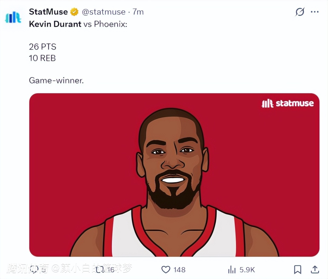 NBA官方也晒出了杜兰特迎着防守干拔的准绝杀三分球,全场球迷高呼MVP。