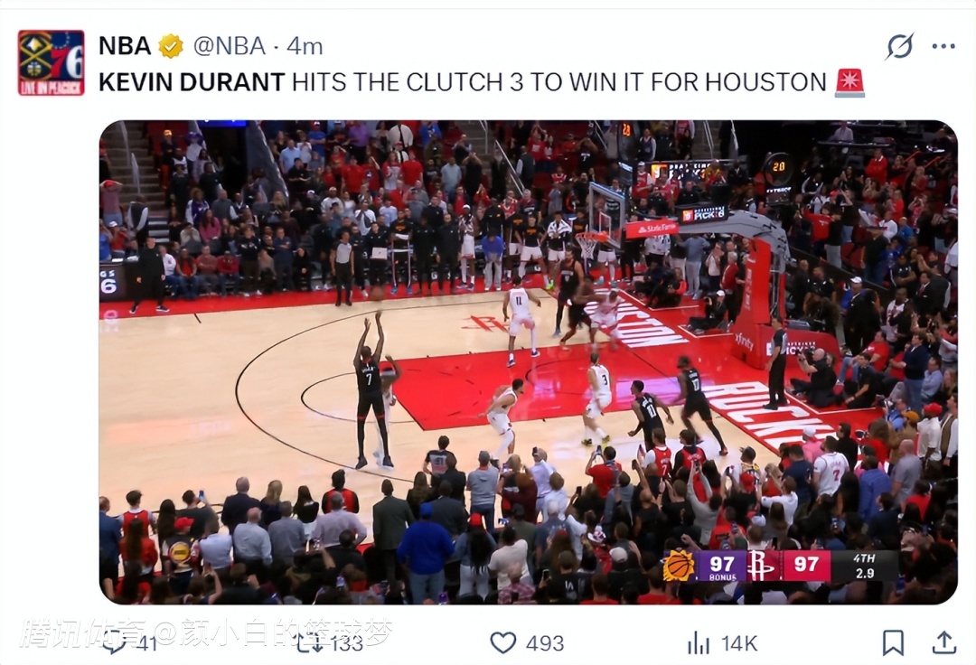 末节杜兰特的两个三分又打铁,火箭一度反超7分后连续的失误、打铁又被太阳反超,两队打成97-97后都不拿分,布克三不沾后给了火箭5.1秒,这时候死神降临了,1.1秒三分准绝杀来了。