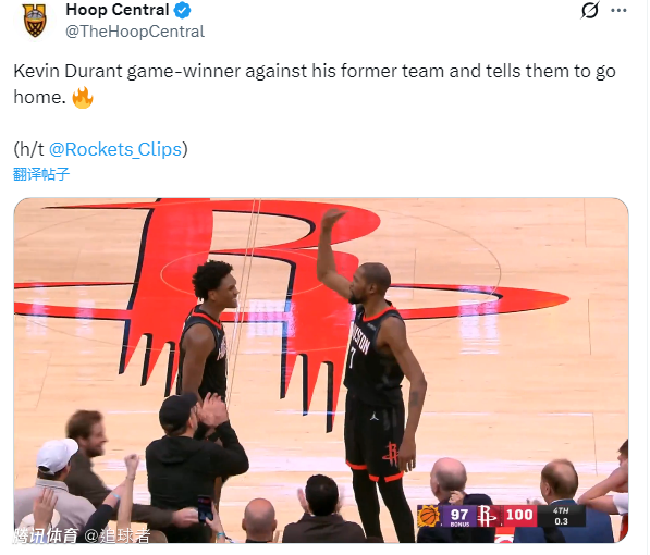 北京时间1月6日,NBA常规赛火箭主场100-97险胜太阳,申京因脚踝扭伤缺席比赛,杜兰特出战38分钟,21投9中、三分12中2拿到26分10篮板4助攻;生死时刻,杜兰特1.1秒三分绝杀手刃旧主,KD绝杀后歪嘴招手疯狂庆祝,示意让太阳滚回家。