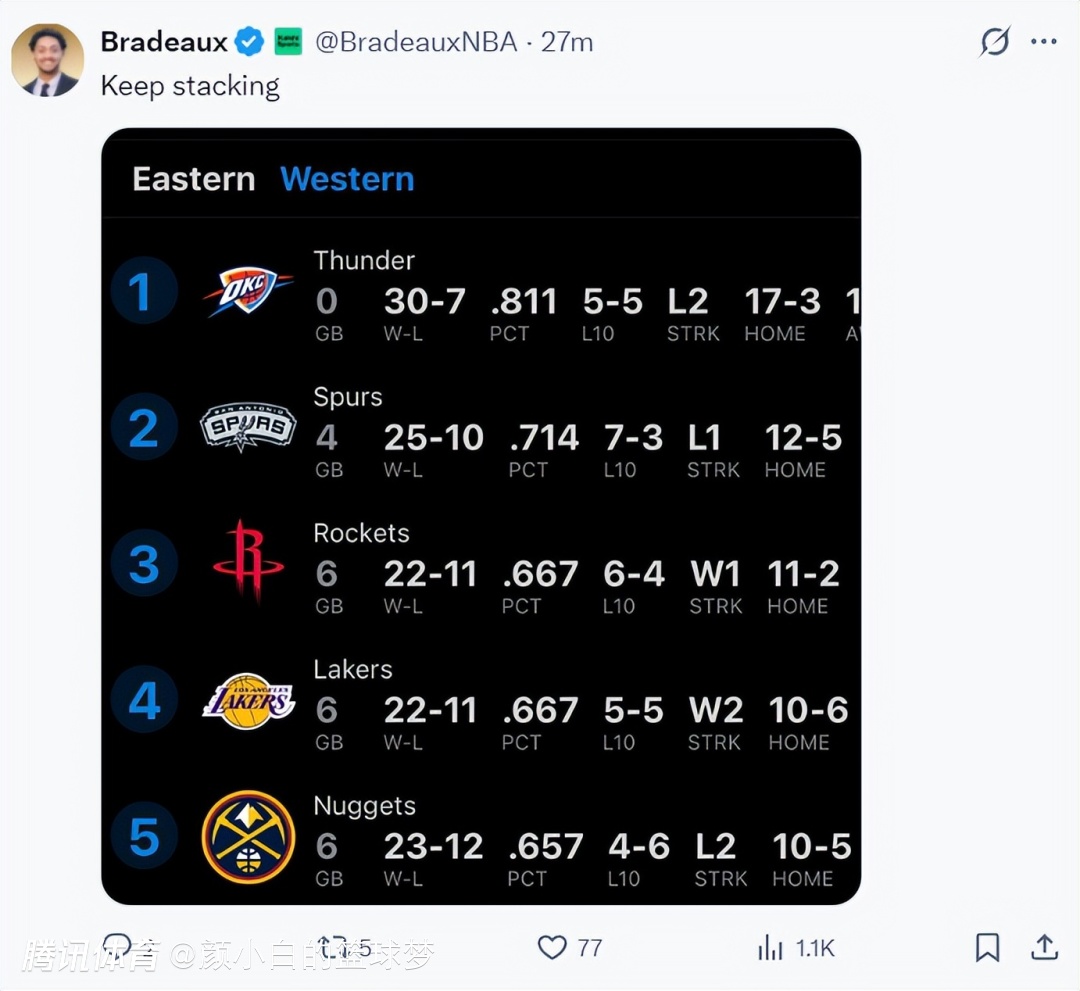 这场比赛后火箭队已经升至西部第三,火箭距离西部第二的马刺只剩下两个胜场差而已。