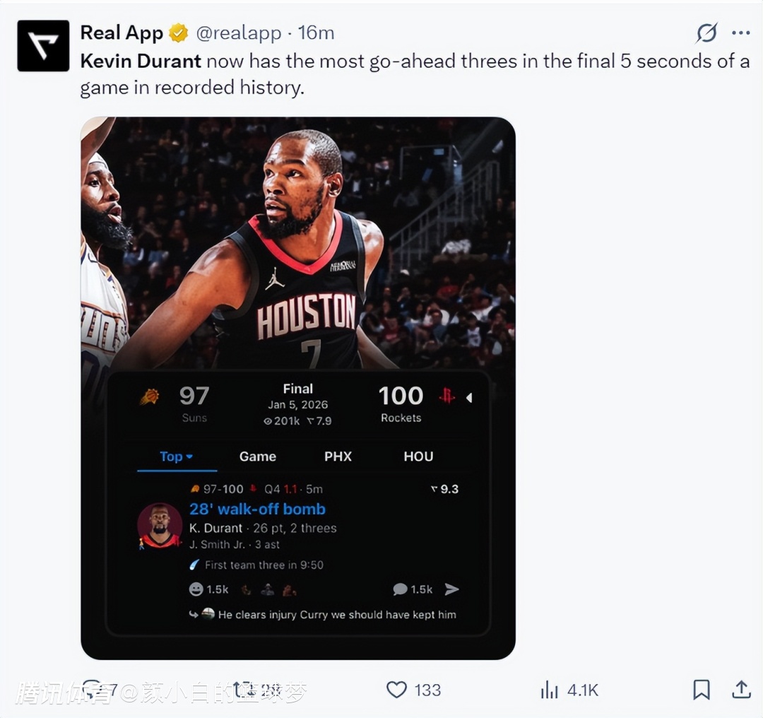 37岁的老死神再一次上演了死神降临,我们已经很久没有见识到死神镰刀的威力了,这一场比赛布克、狄龙、乔丹-奥特见识到了,决胜球真的早该交给杜兰特。