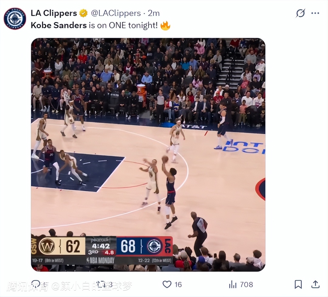 北京时间1月6日,快船以103-102拒绝勇士逆转避免连败。这场比赛哈登因为肩膀酸痛缺席,泰伦卢让新秀科比-桑德斯打先发二号位,邓恩移动到一号位,没想到这位也叫科比的23岁大龄新秀迎来了生涯之夜,全场比赛拿到20+7创造生涯新高,快船赢球海报还是这位23岁的年轻人。