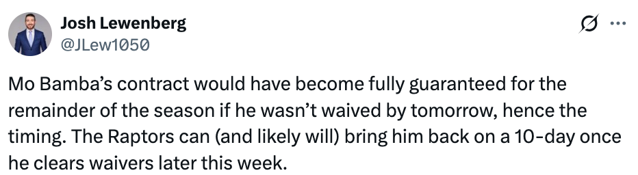 北京时间1月7日,猛龙已经裁掉班巴,随后猛龙队记Josh Lewenberg跟进报道,如果猛龙不在明天之前裁掉班巴,他合同本赛季剩余部分的薪资就会转为全额保障,所以球队选择在这个时间点操作。等班巴本周晚些时候度过澄清期后,猛龙可以(且大概率会)用10天短合同重新签下他。