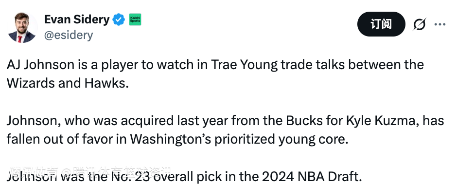 北京时间1月7日,据美记Evan Sidery报道,在奇才与老鹰关于特雷-杨的交易谈判中,AJ-约翰逊是值得关注的球员。