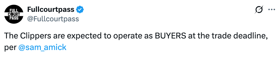 北京时间1月7日,据美记Sam Amick报道,快船队预计会在交易截止日扮演买家角色(即通过交易补强阵容)。