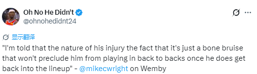 “但我还要补充一点:关于他的伤病性质,事实上这只是一次骨挫伤。消息源透露,一旦他正式回归轮换阵容,这次伤病并不会限制他出战背靠背比赛。所以,如果文班亚马今晚能够出战且一切顺利,那么明天在主场对阵湖人的背靠背第二战,他应该也能上场。”