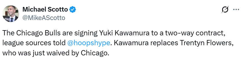 北京时间1月7日,据名记Scotto报道,芝加哥公牛队将以双向合同签下河村勇辉。河村勇辉将填补此前被公牛裁掉的弗劳尔斯离队后的位置。公牛队一签一裁,调整了双向合同球员。