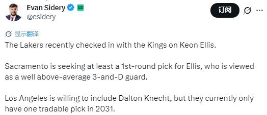 据悉,国王方面为埃利斯开出的要价是至少一个首轮签,这位球员被视作是一名远超联盟平均水准的3D型后卫。湖人方面有意将克内克特纳入交易筹码,但他们目前手中仅有一个2031年的可交易选秀权。