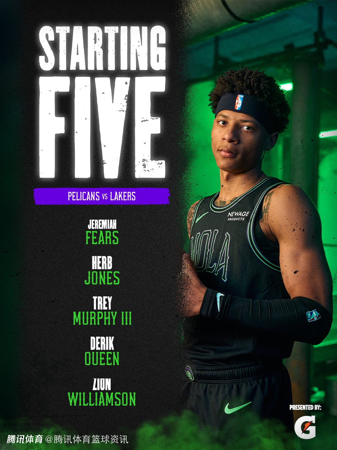 鹈鹕首发五人为:特雷-墨菲、锡安、德里克-奎因、赫伯特-琼斯、费尔斯。