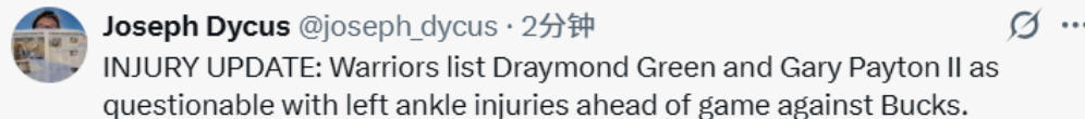 塞斯-库里因左侧坐骨神经发炎将缺席比赛,德雷蒙德-格林和佩顿二世均为左脚踝扭伤,状态为出战成疑。