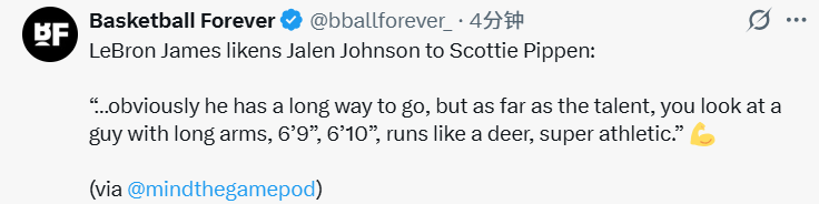 北京时间1月7日,湖人队球员詹姆斯在个人播客节目《Mind the Game》中谈到了老鹰队球员杰伦-约翰逊,并认为其天赋堪比前公牛队球星皮蓬。