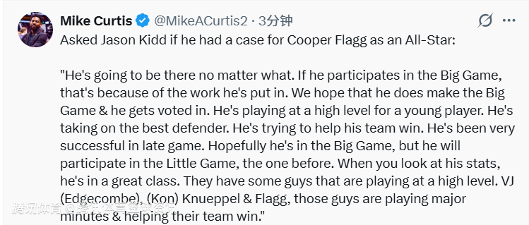 即便最终未能站上全明星正赛赛场,他也肯定会出现在正赛前的全明星新秀赛中。单看他的数据便可知,他已是同届球员中的佼佼者。这届新秀里不乏表现出色的球员,VJ-埃奇库姆、克努佩尔还有弗拉格,他们都在球队中承担着重要的轮换角色,为球队赢球贡献着关键力量。”