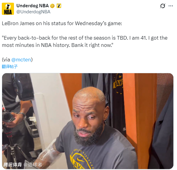 赛后谈到明日是否出战对阵马刺的背靠背比赛;詹姆斯表示:我已经41岁了。本赛季剩余的背靠背比赛我是否参赛都是待定。我现在是NBA历史上出场时间最多的球员,这一点可以确定,我们在说些什么?