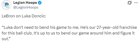 詹姆斯还力挺东契奇,说道:他不需要为了我改变他的比赛方式。他是我们球队的未来,是这支球队的27岁当家球星,我们应该围绕他来调整我们的打法,并找到最佳方案。